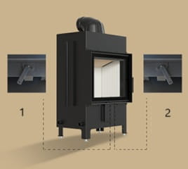 - Ustawiając regulator dopływu powietrza - od 50% do 100% - powietrze jest dostarczane na tylną ścianę komory spalania oraz kanałami na szybę. Dodatkowo powietrze kierowane jest pod ruszt kominka, co wspomaga proces rozpalania.